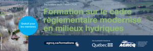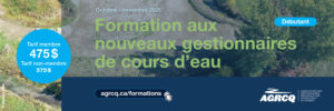 La formation s’adresse à des nouveaux gestionnaires de cours d’eau. Elle a été élaborée par des gestionnaires de cours d’eau expérimentés. Une équipe de formateurs, membres de l’AGRCQ et d’expériences diverses, pourront vous expliquer les obligations et responsabilités en matière de gestion de l’eau.